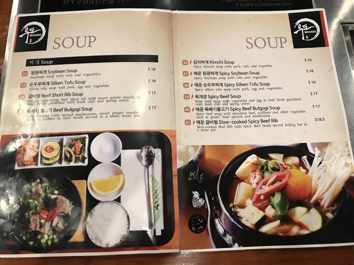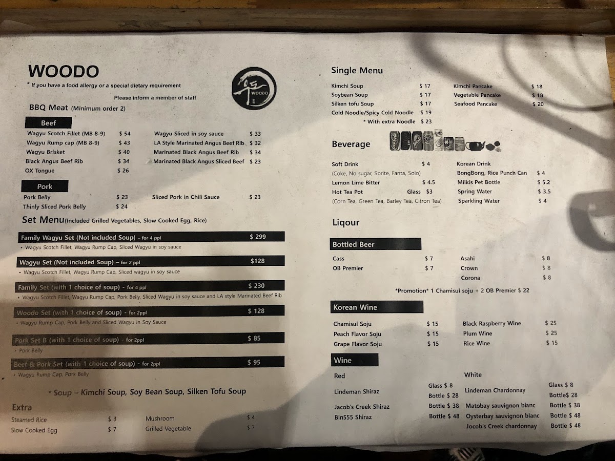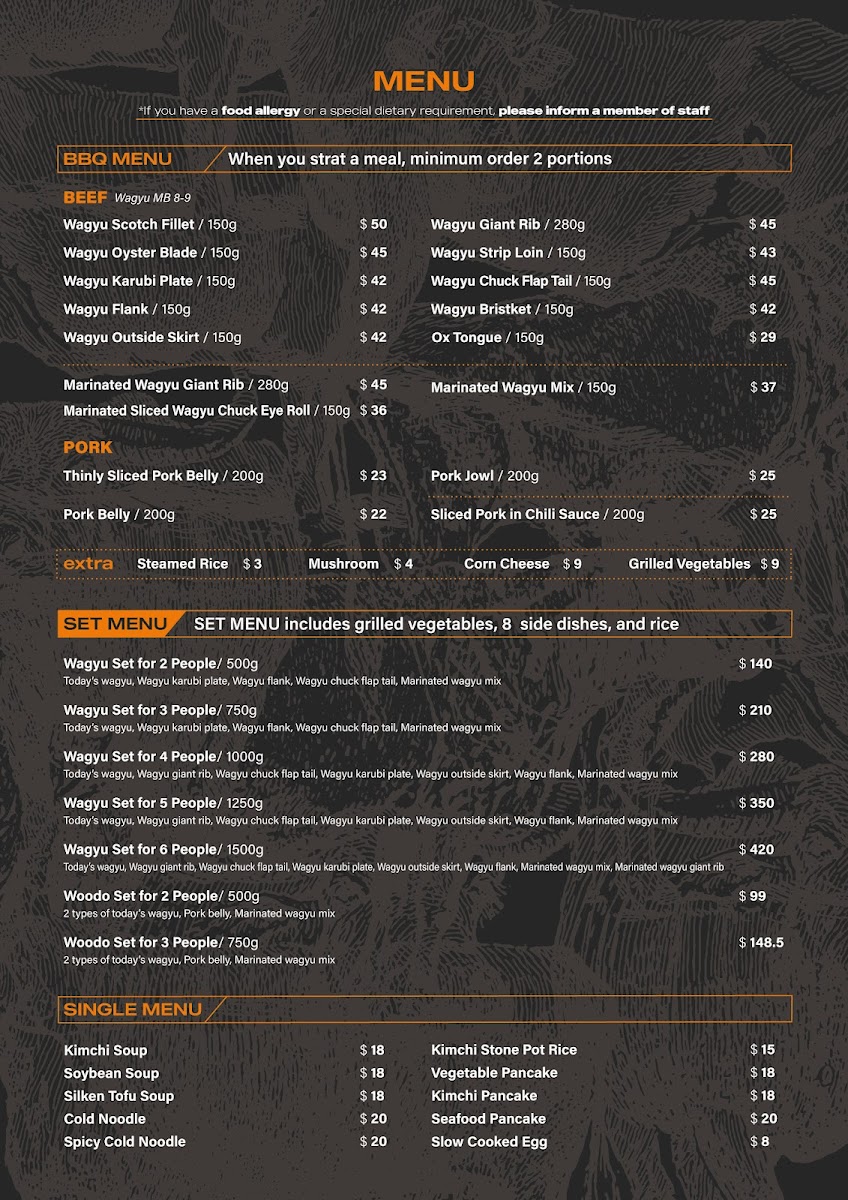 Welcome to Woodo, where culinary adventure awaits in every bite! Located at 179 King St, Melbourne VIC 3000, our menu is a delightful fusion of authentic Korean flavors and innovative dishes that will leave you craving more. Savor our sizzling Korean BBQ, dive into the rich and comforting Seafood Hot Pot, or treat yourself to the delicate Unagi Nigiri. Don't miss out on our fan-favorite Sweet Chilli Fried Chicken or the melt-in-your-mouth Wagyu Sirloin and Scotch Fillet. For those seeking something light yet satisfying, our Silken Tofu Soup and Stream Egg are perfect choices. Complement your meal with Assorted Tempura or our mouthwatering Marinated Pork and Beef Ribs, especially the 갈비살 short rib! Join us at Woodo and let your taste buds embark on a delicious journey through our signature creations.